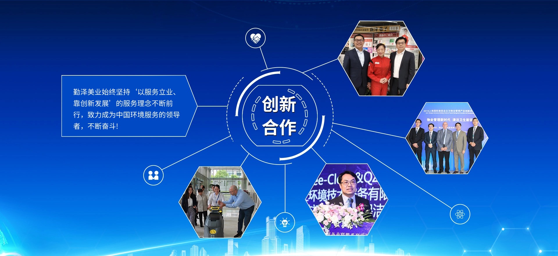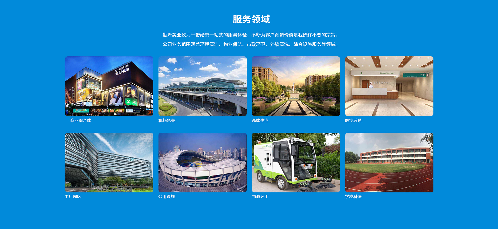 公司致力于把“勤澤美業(yè)”培育成眾口皆碑、令人尊敬、具有長期價(jià)值的服務(wù)領(lǐng)袖品牌。業(yè)務(wù)范圍涵蓋環(huán)境清潔和綜合設(shè)施管理服務(wù),公司具備環(huán)衛(wèi)、保潔、石材等多個(gè)行業(yè)一級資質(zhì),致力成為中國環(huán)境服務(wù)行業(yè)的領(lǐng)導(dǎo)者。
